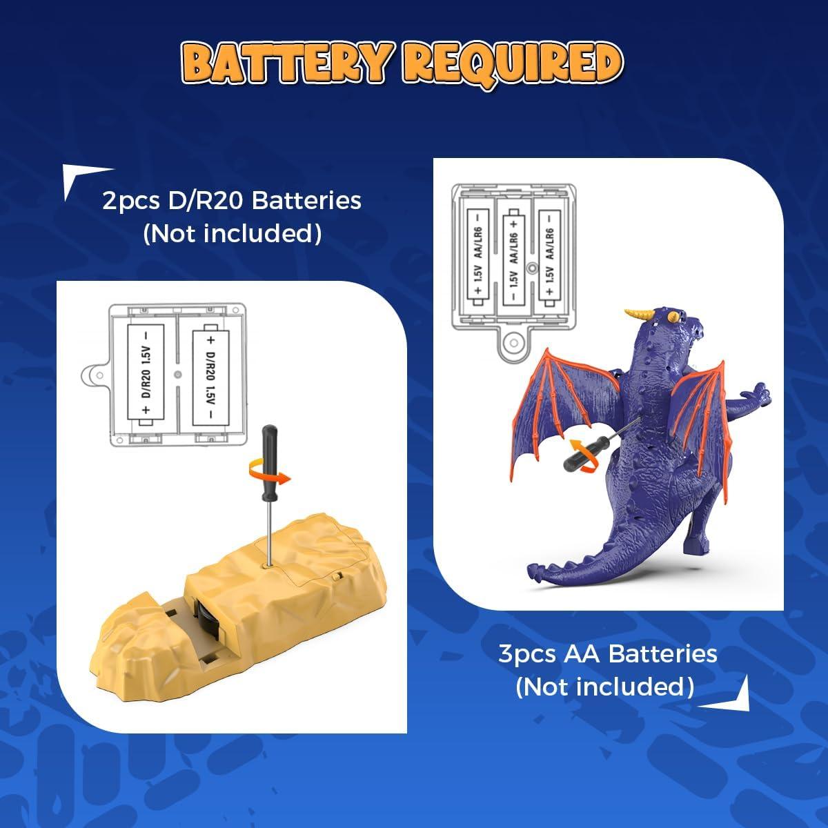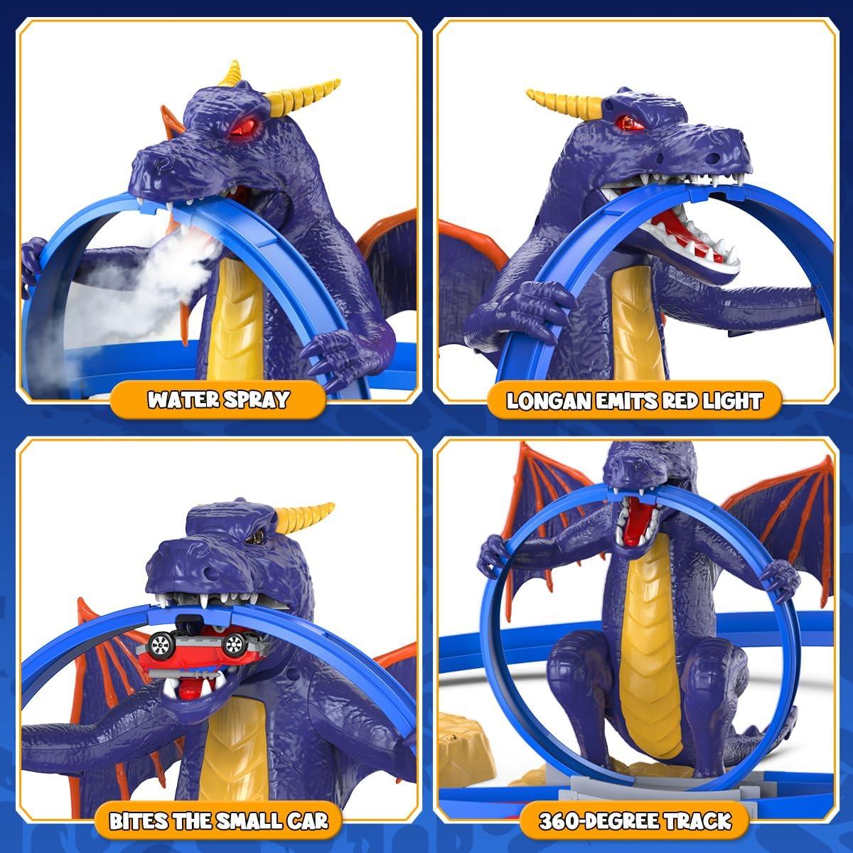 Cool Exterior Design: a winged dragon with sharp claws, clutching the fragile track, with a small car traveling on the track that seems like it will fall into the dragon's claws at any moment. When running, the dragon's mouth sprays mist, and its red-glowing eyes give it a unique intimidating presence. We believe that the unique design will instantly catch children's attention.