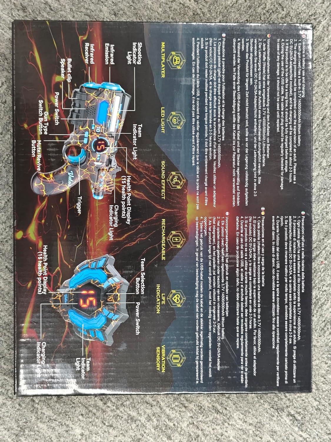 Upgrade 2,4GHz Laser Tag Set: Bring the ultimate laser tag game experience to your backyard, park, or outdoor space! This rechargeable laser tag set includes 2 guns and 2 vests, perfect for kids, teens, and adults aged 6-12+, 2.4GHz data synchronisation which keeps a score for all players and an LED display on both the guns and vests, this set delivers non-stop action and excitement. Whether it's a family game night, or a birthday party, this cool and tech-savvy set is sure to be a hit!