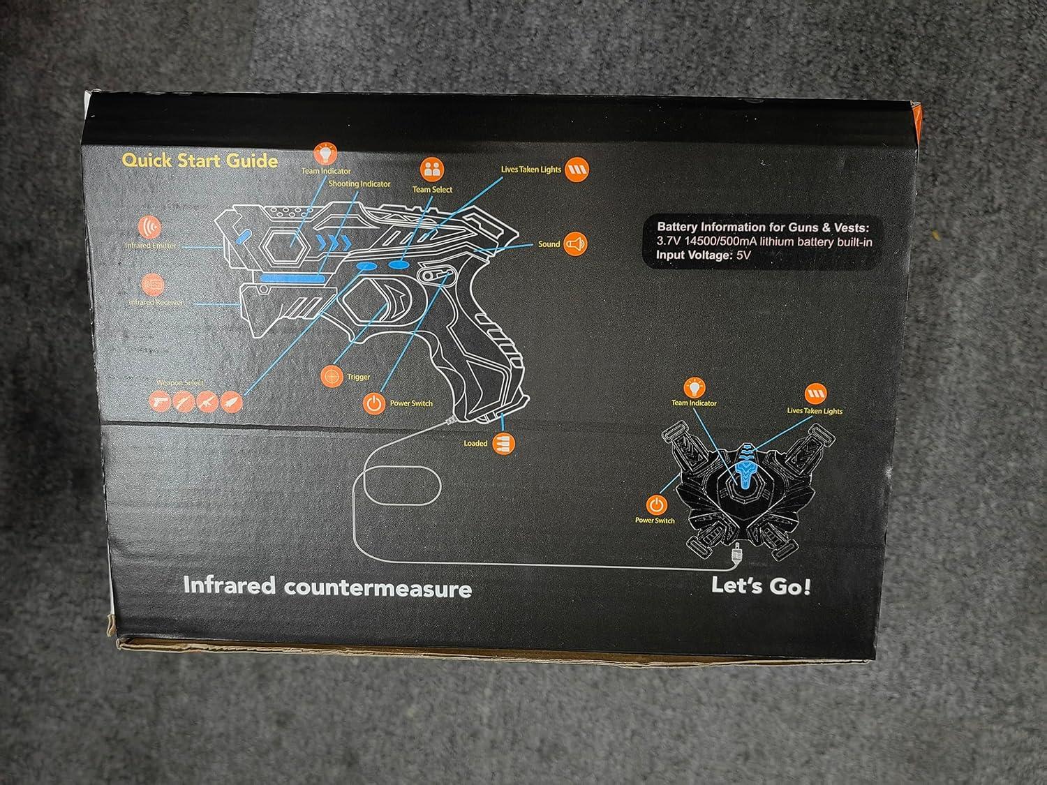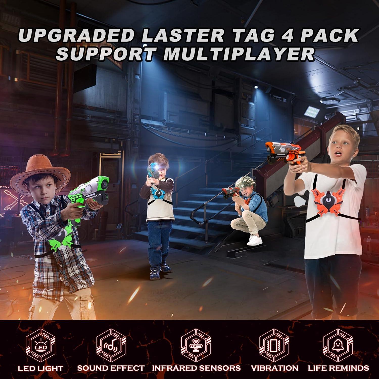 UPGRADED RECHARGEABLE BATTERIES: Compared to the previous version of the laser tag set that needed to be removed for charging, this upgraded version of the laser gun of 4 set has built-in batteries, equipped with 8 rechargeable batteries and 2 1-trailer 4-USB chargers, which saves you time and prevents you from losing your batteries. With only 2-3 hours of charging, you can play with this awesome laser tag for up to 4 hours!