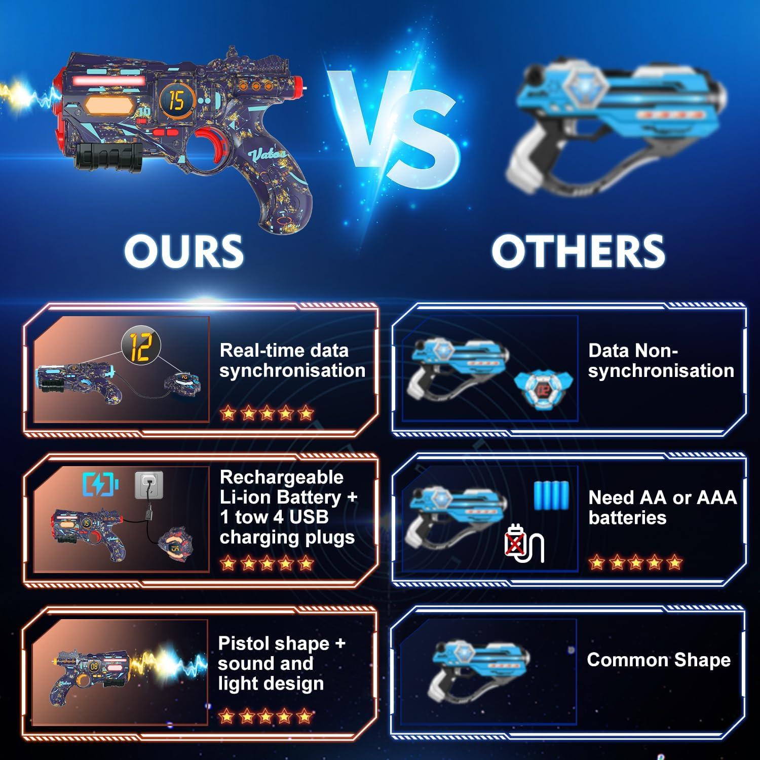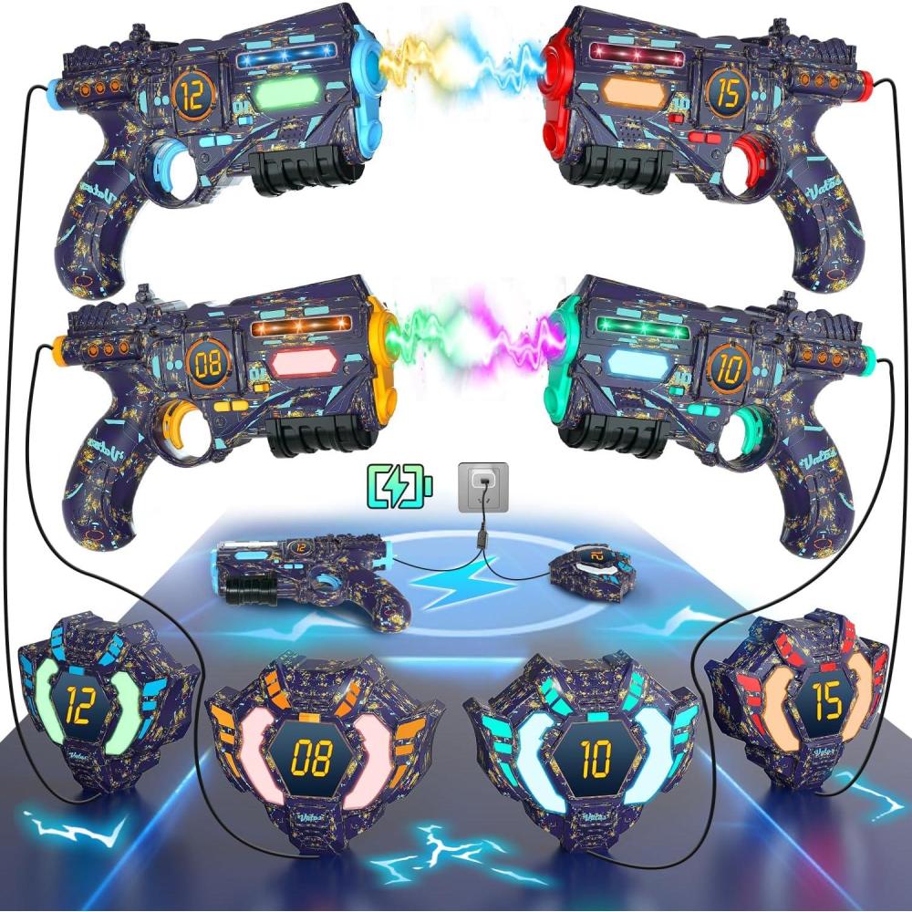 UPGRADED RECHARGEABLE BATTERIES: Compared to the previous version of the toy gun set that needed to be removed for charging, this upgraded version of the toy gun of 4 set has built-in batteries, equipped with 8 rechargeable batteries and 2 1-trailer 4-USB chargers, which saves you time and prevents you from losing your batteries. With only 3-4 hours of charging, you can play with this awesome toy gun for up to 4 hours