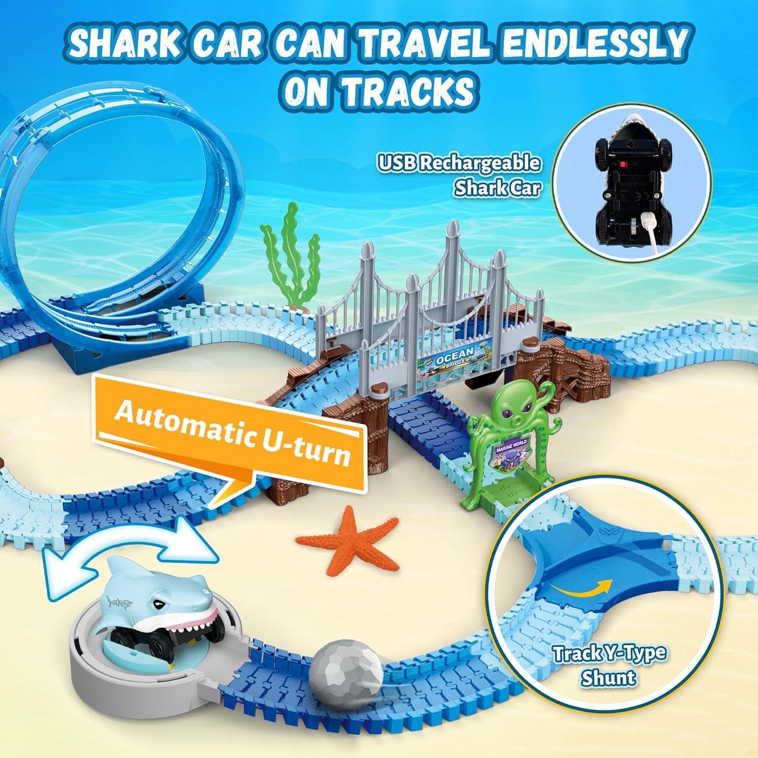 UNDERSEA ADVENTURE PARK – Embark on a magical deep-sea journey! This shark track toy set includes 192 track pieces, a USB-rechargeable shark car, an auto-rotating turntable, Y-shaped split tracks, shark-shaped tunnels, long bridges, arch bridges, an octopus arch, and decorative elements like starfish and coral. Everything your child needs is included to easily build a multi-level underwater track world full of challenges and vibrant scenery, sparking imagination and offering immersive play.