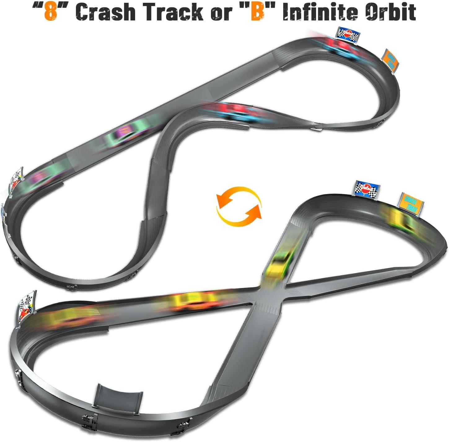 2 in 1 Slot Racing Track: this racing set can be put together as a figure 8 or B shaped track, if you want a more exciting racing experience, the figure 8 is more suitable for you, because at the cross track, you don't know when the high-speed racing cars can collide, the excellent impact of this uncertainty is simply awesome! But the B-shaped track is better for racing experience, you don't know whether you can catch up or stay ahead, it's really a great track racing toy!