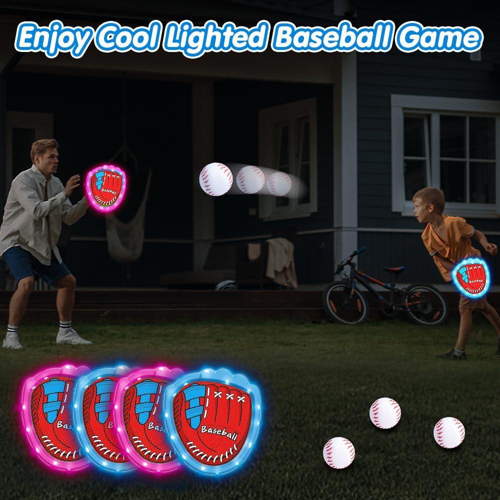 COOL LIGHT EFFECT: 4 catchers set comes with a cool light effect.Simply flip the switch on the edge of the glove to create a lighting effect that instantly ignites the passion of the game. Whether it is day or night, the light effect will add a magical color to outdoor activities and exercise your kid's motor skills