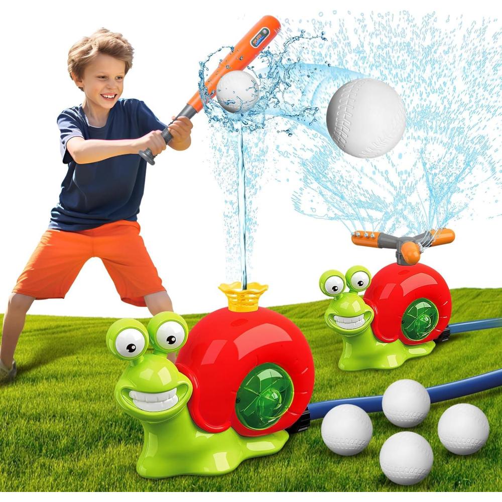 IDEAL SUMMER WATER PLAY GIFT – The sprinkler baseball toy is an ideal summer gift for boys and girls ages 3 4 5 6 7 8 9 10 11 12. The water sprinkler toy set includes: 1 * snail sprinkler, 1 * water column nozzle, 1 * 360° rotating nozzle, 1 * retractable baseball bat, 4 * baseballs, 1 * ground stake. The snail's appearance design is interesting and attractive, which can immediately attract children's attention. Get ready for a summer of water play and baseball fun!